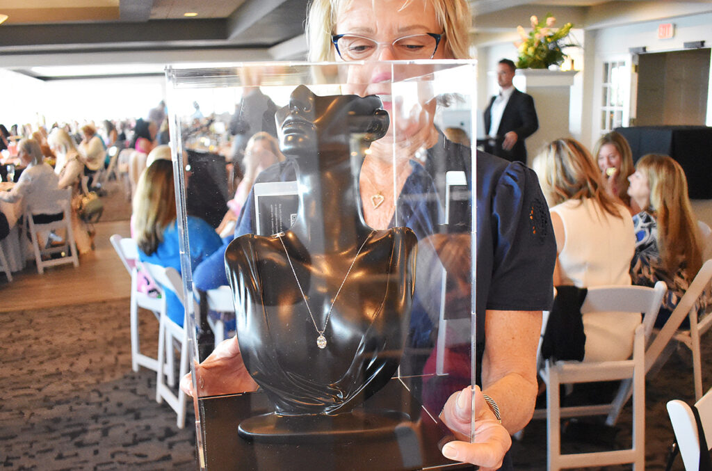 The fourth and final auction item symbolized the garden club’s diamond anniversary: a three-carat, oval, lab-grown diamond necklace, with a white gold chain and setting. As Slicker began soliciting bids, garden club member Janice Gale walked around the room showing the encased necklace to potential bidders. The winning bid was $2,500.