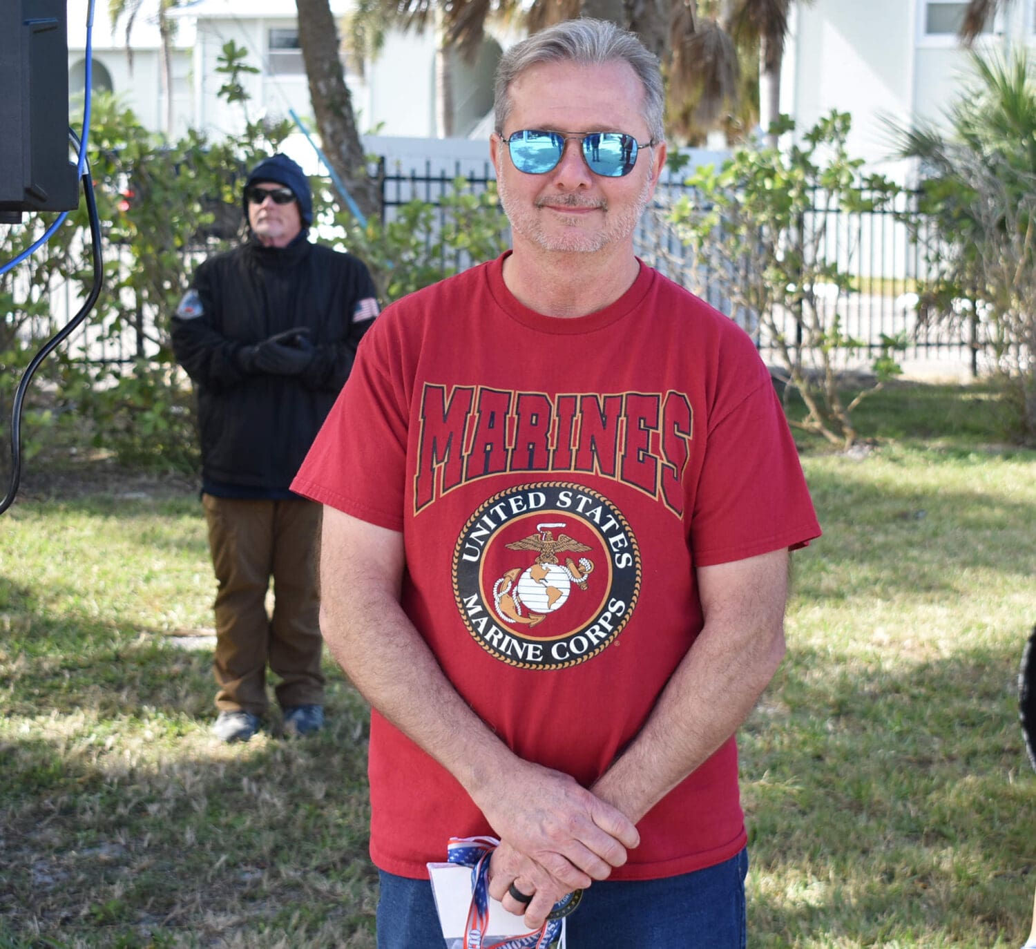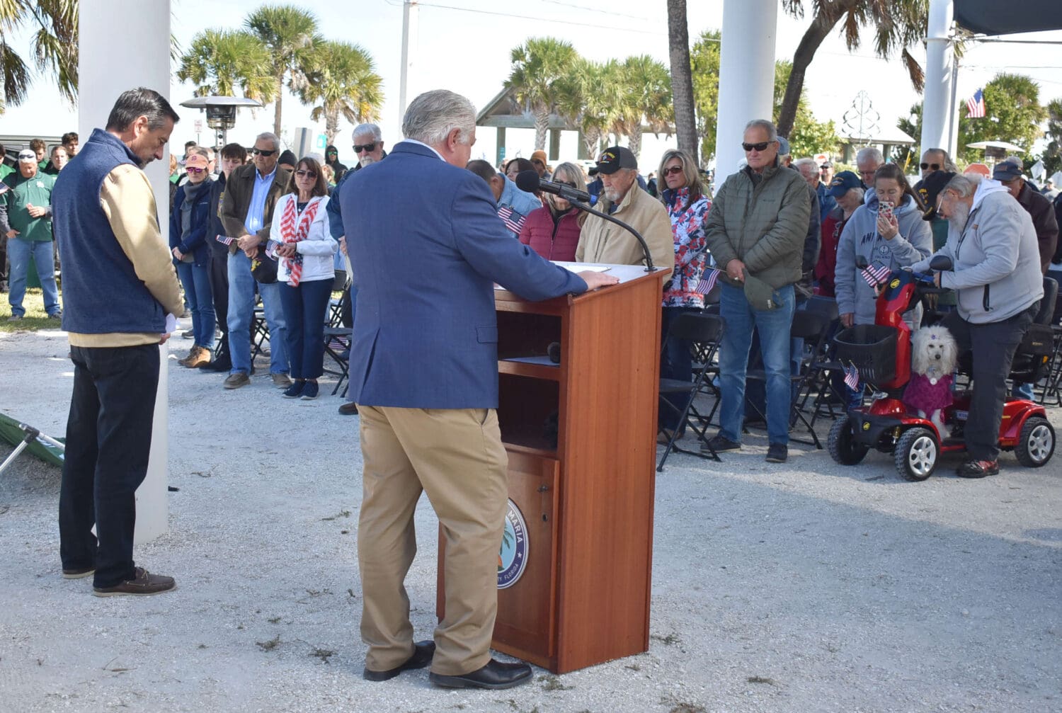 After the parade, the Lakewood Ranch High School band members took their seats in a large tent that stood where the recently removed Anna Maria Post Office trailer stood for several months after the hurricanes. Many parade attendees and veterans took their seats under the City Pier Park shade sail structure.