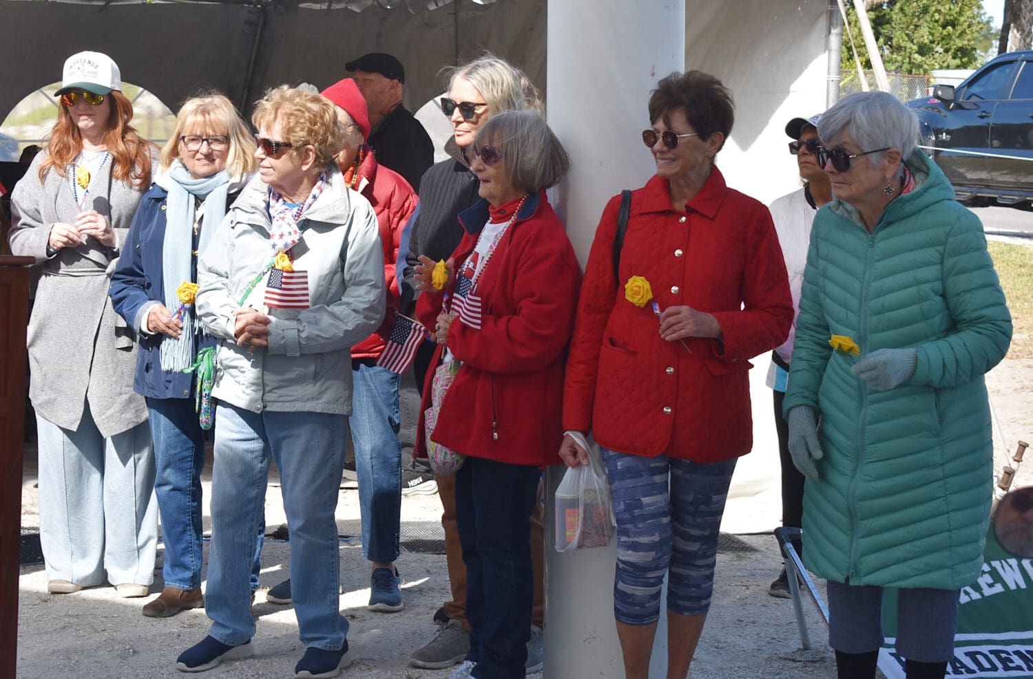 The mayor introduced the three grand marshals and recognized the elected officials in attendance. He then called forward the spouses and significant others of those who served in the military and city staff members presented each of them with a yellow rose.