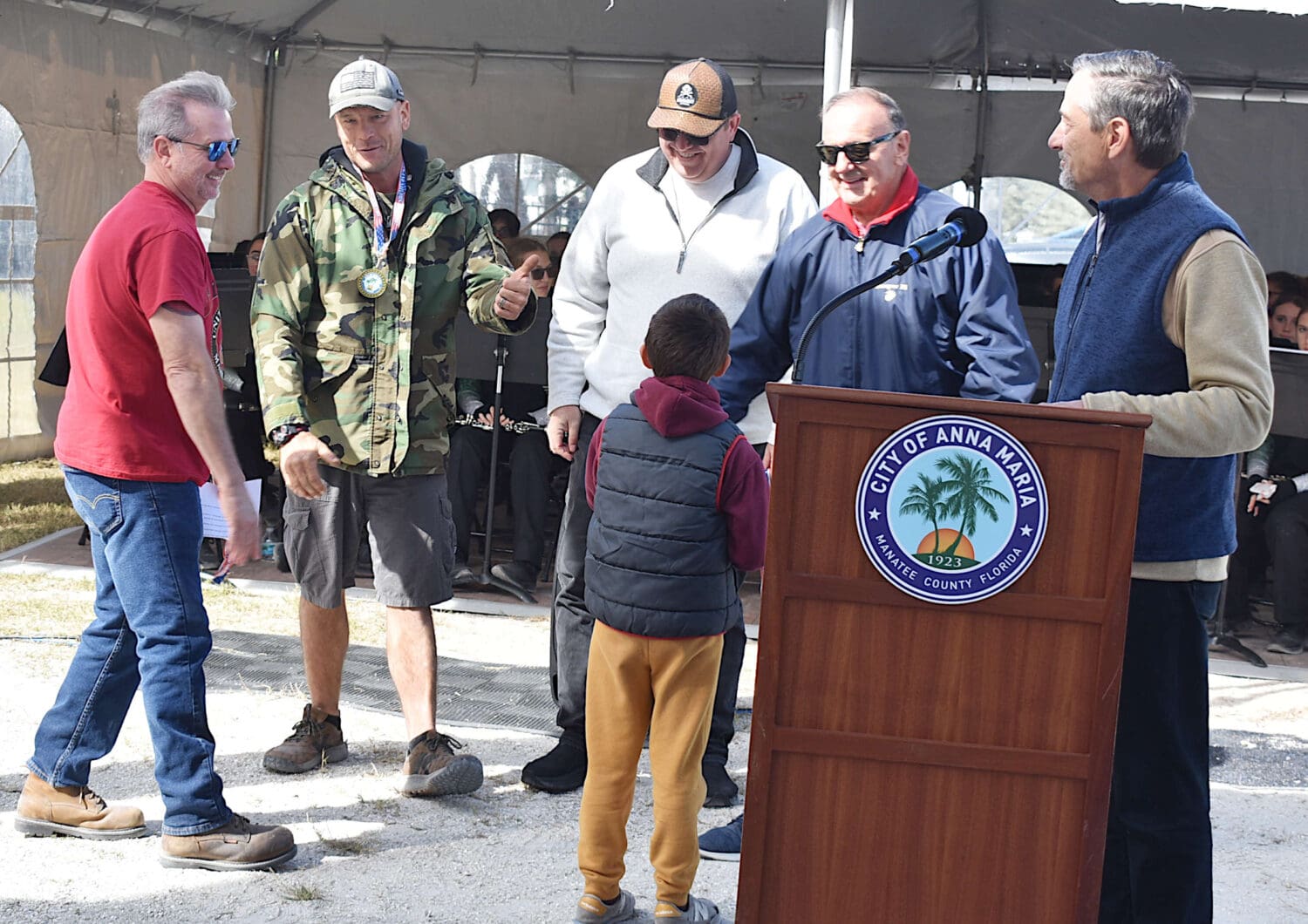 The mayor then called forward the veterans according to the military branch in which they served: Army, Air Force, Navy, Marine Corps and Coast Guard – and Anna Maria Executive Assistant Barbara Jeffries’ 8-year-old son, Jackson, presented each veteran with a commemorative medal.