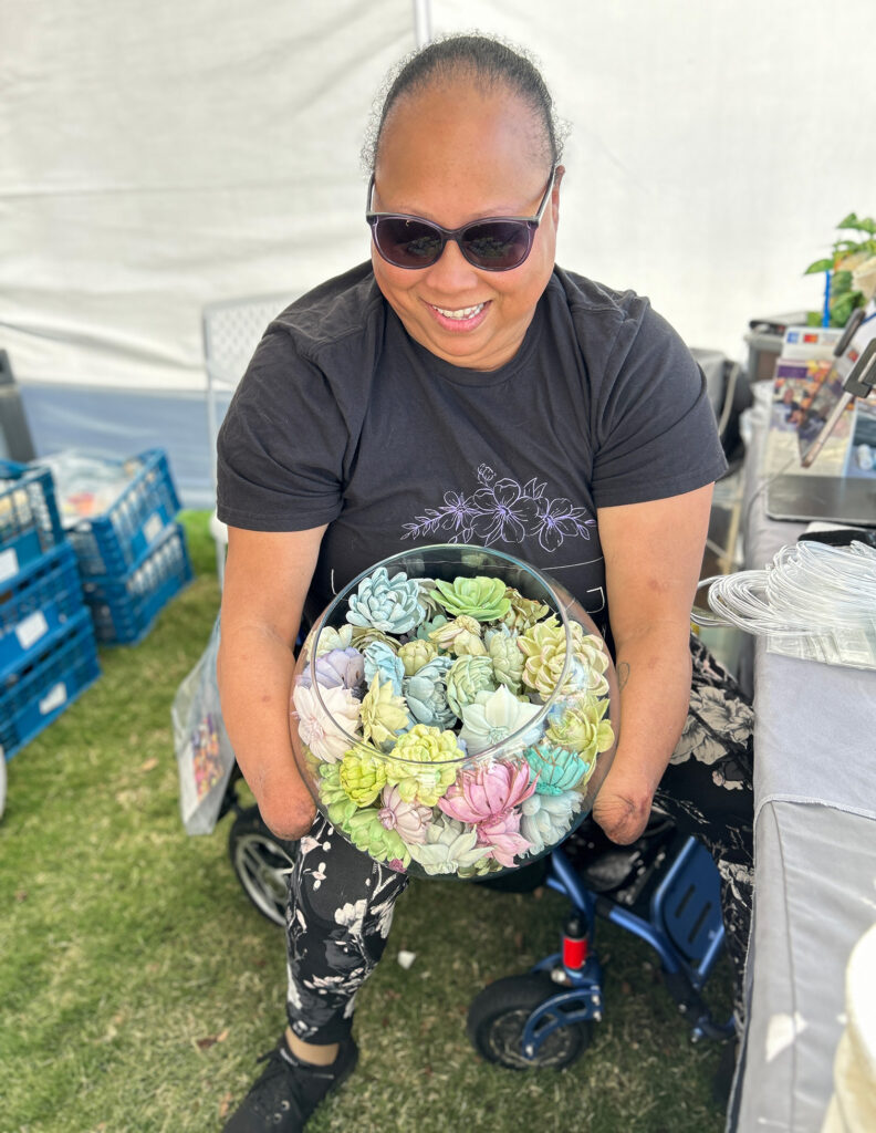 Jacqueline McMillan, of Mobile, Alabama, exhibited the balsa wood flower arrangements she created through her business, Love by JM. McMillan, a quadruple amputee,produces her work using strapped tools and paintbrushes, arranging and coloring the wood to create realistic floral designs displayed in small terra-cotta pots and decorative teacups.