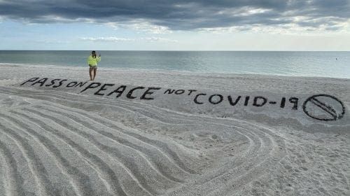 “Pass on peace, not COVID-19” is the inspirational message written in the sands of Anna Maria Island by local artist Jim Shipley, and people all over the world have seen it, thanks to Patricia Filome…