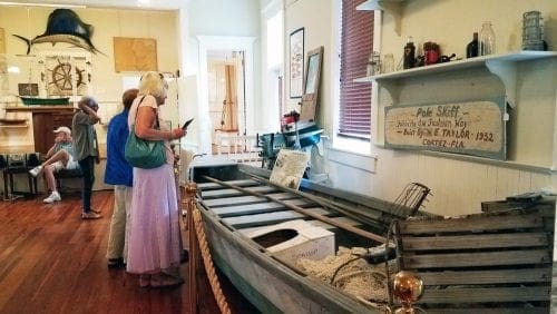 At the event, kids learned how hard it is to clean a drop of oil out of a pan of water – much less the ocean – looked at a cross section of a hatching sea turtle nest and touched the skull of a loggerhead sea turtle. Adults took in the maritime heritage of the historic Cortez commercial fishing village, including displays of a 1932 pole skiff built in Cortez, and the event of the evening, the grand opening of the Burton/Bratton Store, relocated to the museum grounds and restored as The Folk School at Florida Maritime Museum.