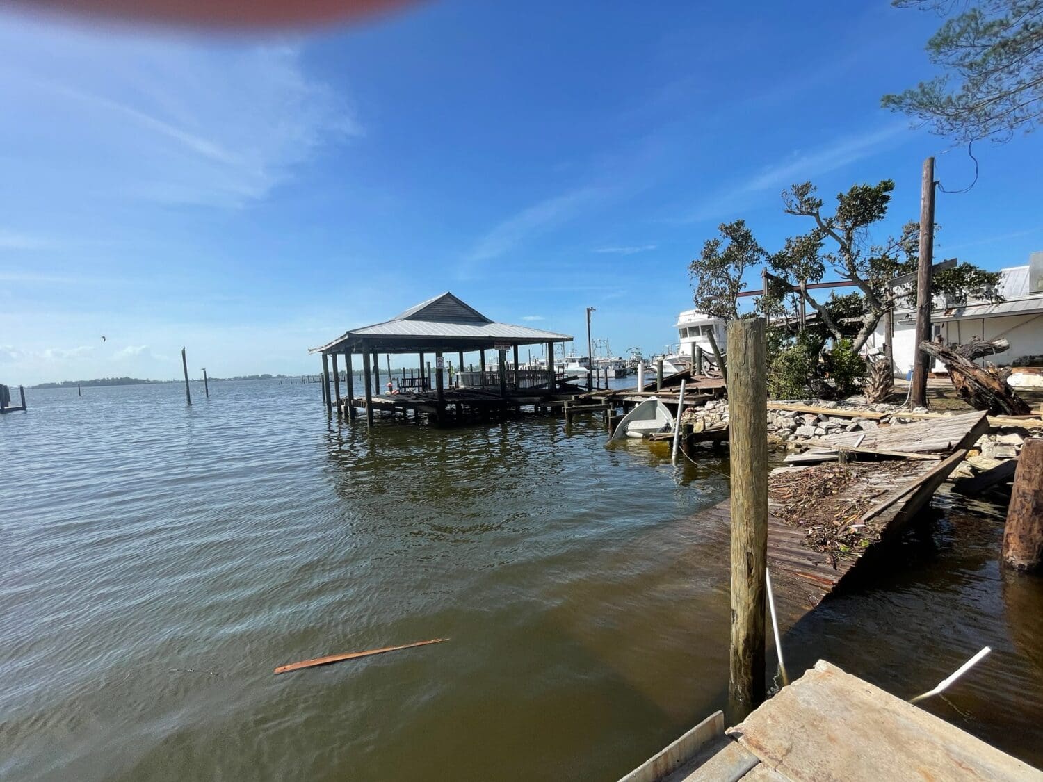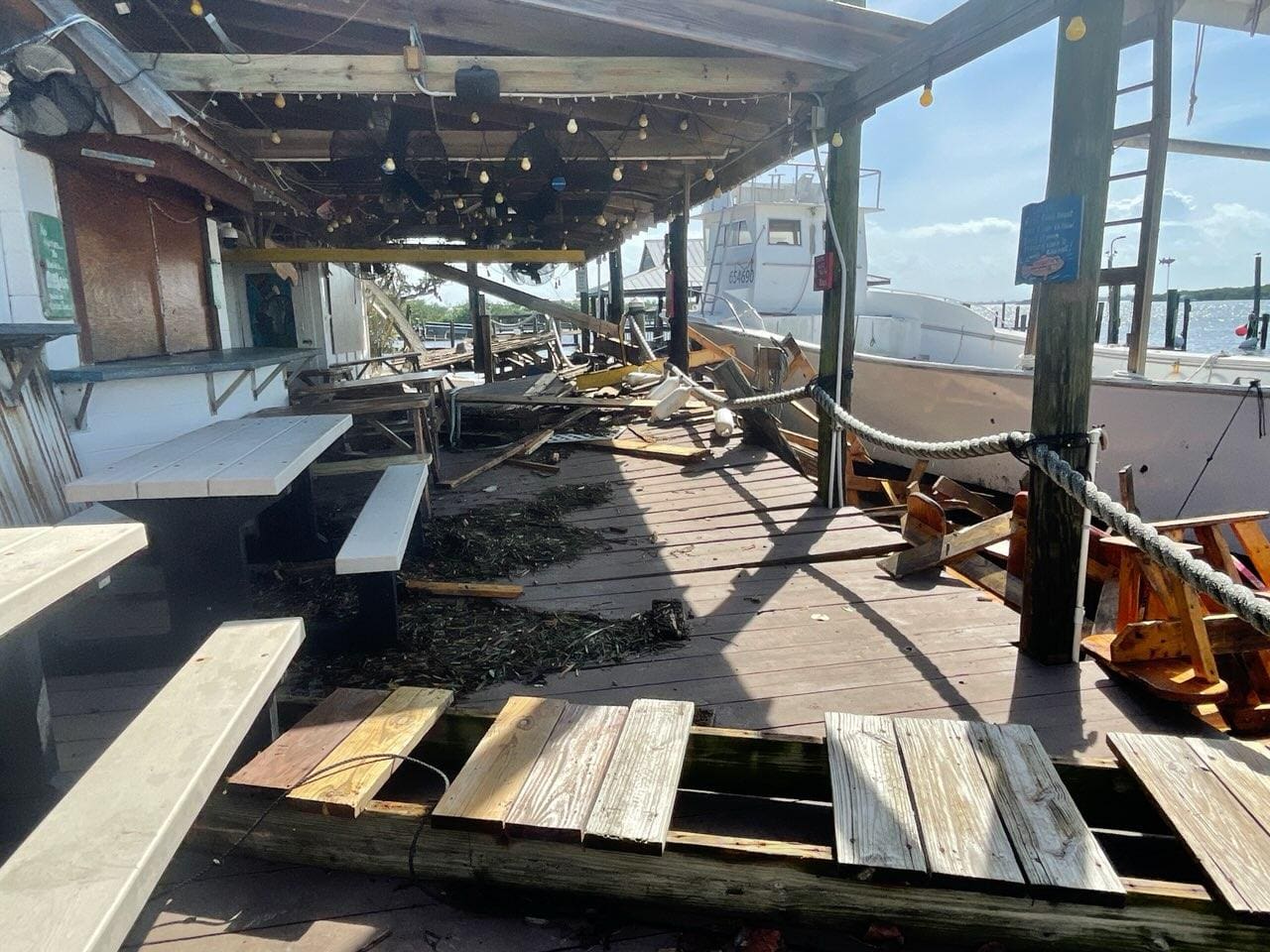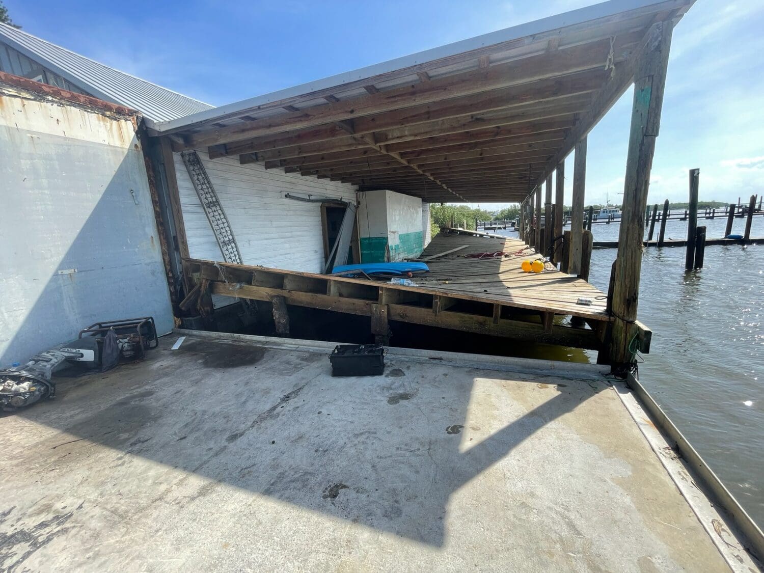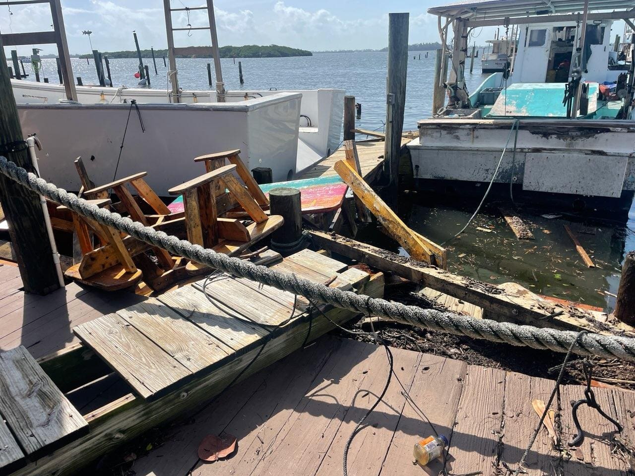 Parts of the deck of the Miller dock were sagging over the water and at Star Fish Co., slats on the dock were broken and tables had tumbled into the water.