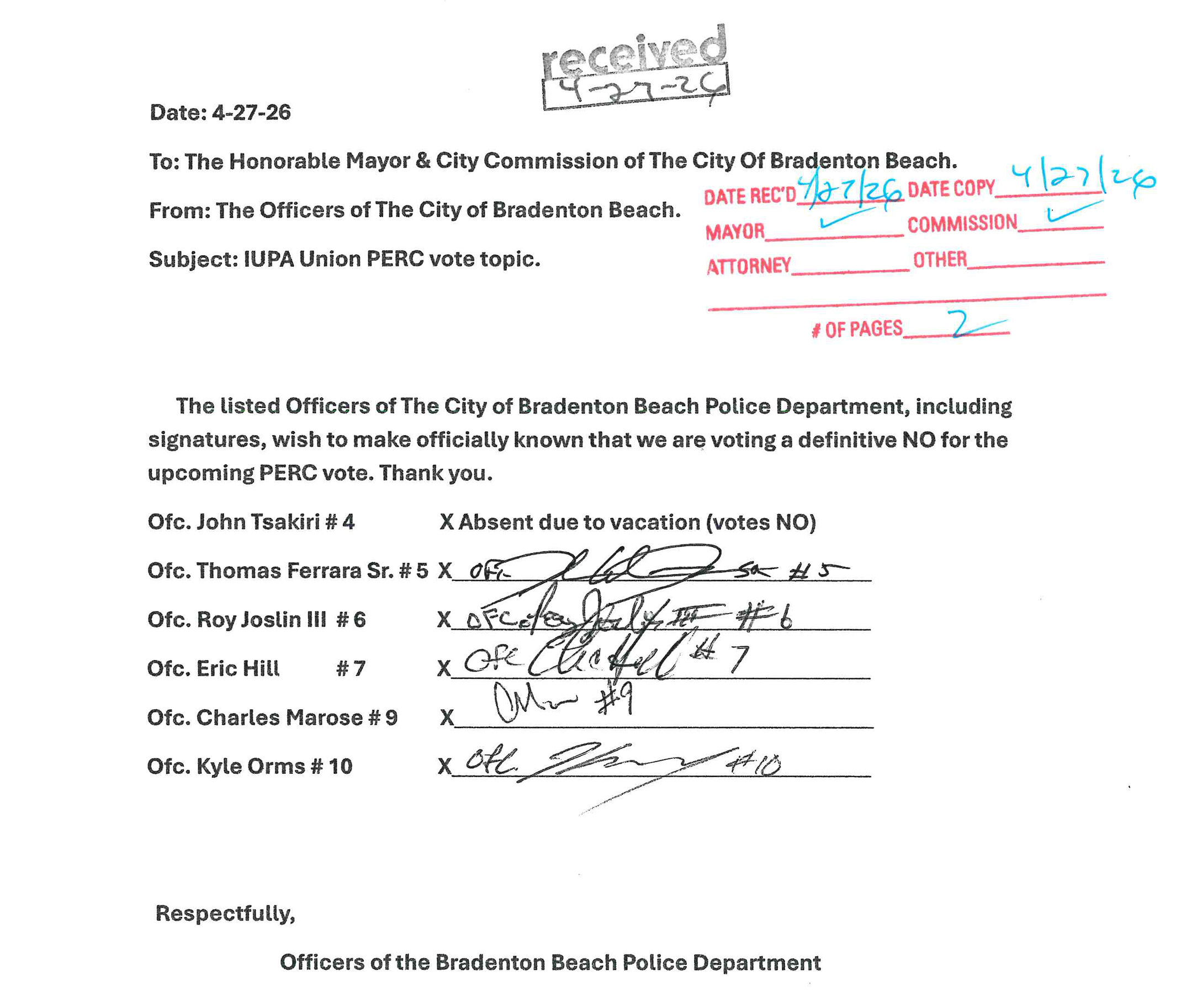 Addressed to the mayor and the city commissioners, the single-page document presented to the city says, “The listed Officers of The City of Bradenton Beach Police Department, including signatures, wish to make officially known that we are voting a definitive NO for the upcoming PERC (unionization) vote. Thank you.”