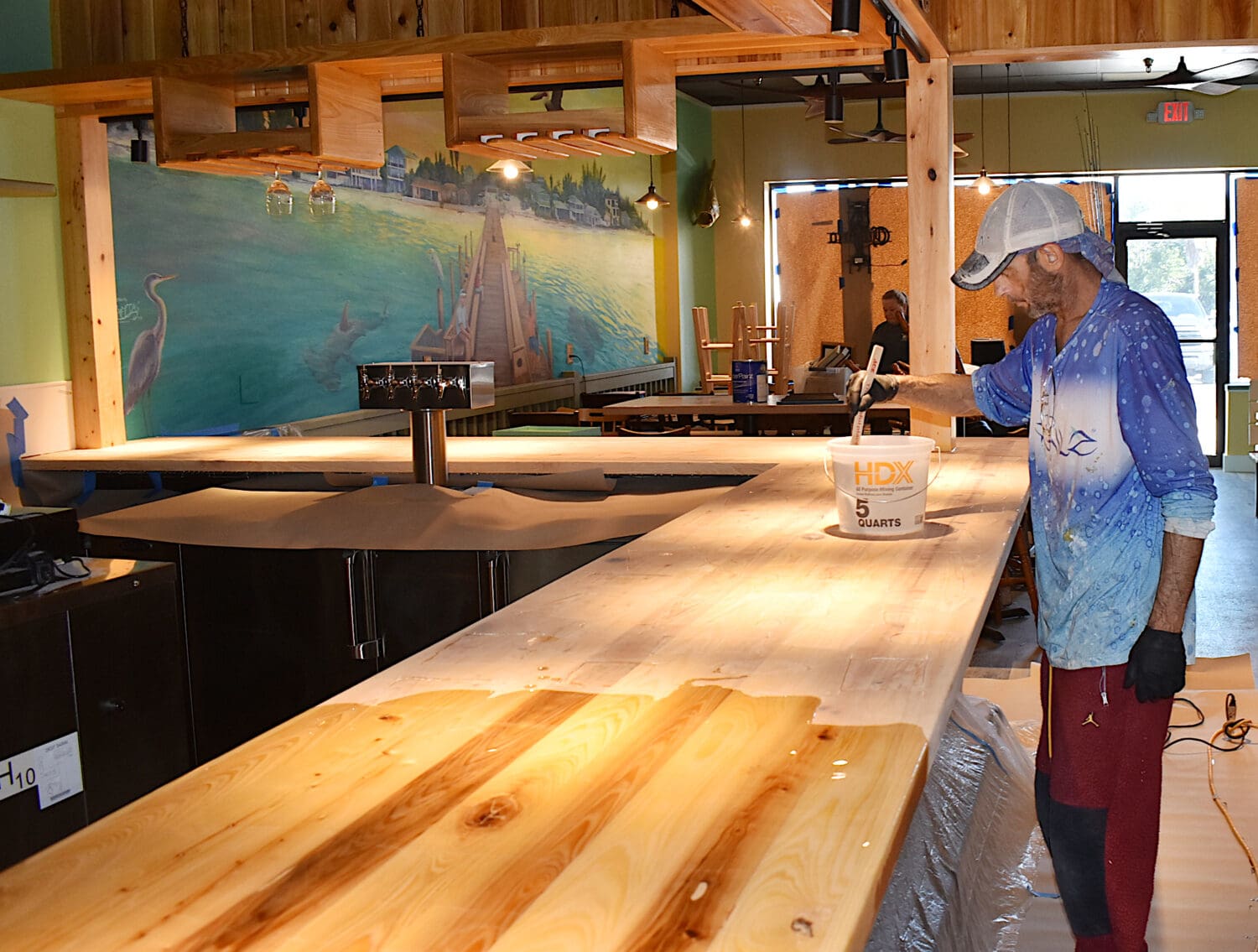 As Lemke spoke, Bimini Bay Construction employee Tom Mineo applied a coat of clear epoxy resin to the sanded down bar top that will feature embedded photos.