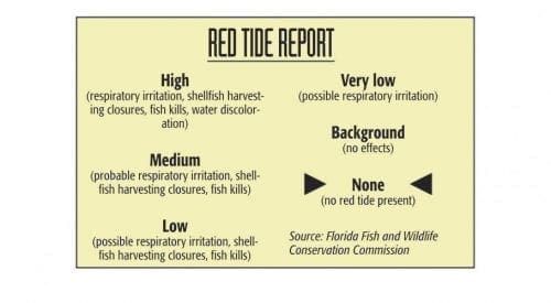 Background concentrations of red tide, or Karenia brevis, have no discernable effects on people or marine life, and are an ordinary component of Gulf of Mexico waters.