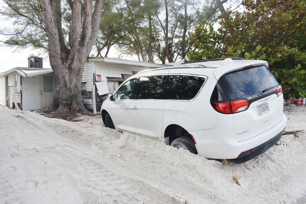 After calling 911 and an unsuccessful attempt to walk to a nearby friend’s home, the pair resigned themselves to riding out the storm in the van, where they eventually fell asleep. Around four in the morning, two police officers arrived in an ATV and drove them to the Bradenton Beach Police Station, along the way driving up and over the large sand piles that accumulated atop Gulf Drive. They were then transported to HCA Florida Blake Hospital, where Kuhlman was examined for a wound on his arm.