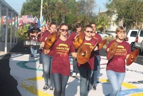 Then came the Manatee High School Drumline marching around the parking lot followed by fourth- and fifth-graders holding large flags from nations around the world. The flags were planted around the school’s Peace Pole, donated years ago by the Rotary Club.
