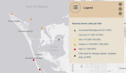 The toxic algae bloom has been spreading in the southwest Gulf of Mexico for the past year, reaching Anna Maria Island in early August. It was detected in Florida’s east coast waters early this month.