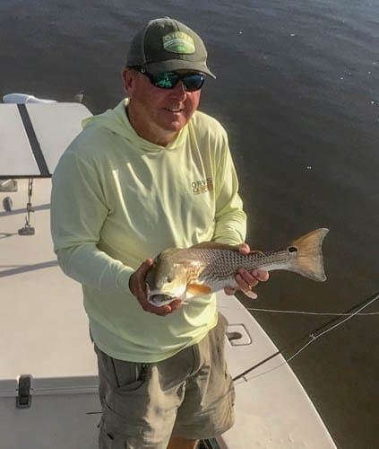 It didn’t take long for us to encounter pushes where redfish were chasing shrimp and small mullet. Stripping about 50 feet of line from his 8-weight rod Edens mounted the bow and began making casts to the feeding reds. It didn’t take long for him to set the hook on a nice red that made a 20-foot run for the deep channel before spitting the fly. A few casts later and he was hooked up again, this time to a 6-pound red that stayed buttoned and put up a nice fight before it was landed, photographed and released. We were able to catch and release several more reds before the tide went slack and the action slowed.