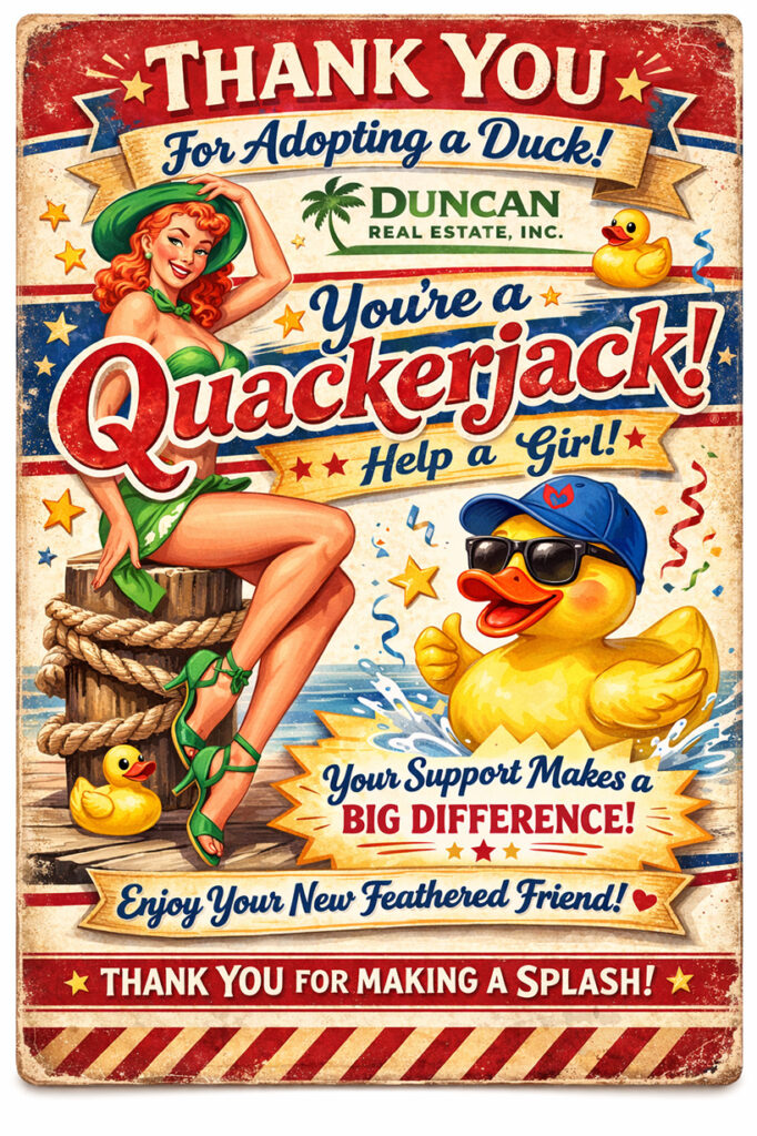The Anna Maria Island-affiliated duck adoption teams and/or sponsors include the Anna Maria Oyster Bar, AMI Dolphin Tours, Sato Real Estate, Duncan Real Estate, Duffy’s Tavern, Wagner Realty, Publix, Swordfish Grill, Air & Energy, HSH Collective, LaPensee Plumbing, Pools & Air, Shady Lady Horticulture Services, Acqua Aveda on the Beach, Hancock Whitney Bank and Grayhawk Windows and Roofing and The Center of Anna Maria Island.