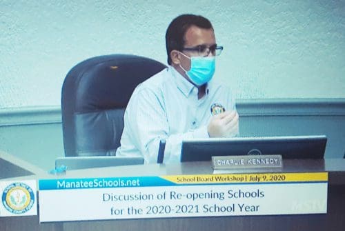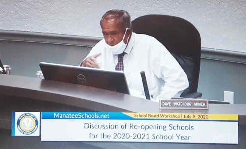 Citing the Florida Constitution, board member Dave Miner said, “Article 9, Section 4b says the school board, the constitutional officers, control the education in Manatee County. The buck stops with us and I believe we have the authority to say there’s not going to be public school in Manatee County for the next month. The blood is on us for anybody who suffers from this. At the same time, we’re supposed to be providing public education for all the children here and that’s the rock and the hard place that the five constitutional officers sitting up here have to deal with.”