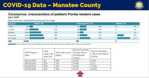“If you look at June 12th through now, and you compare our data and the number of cases compared to the state, in each one of these calculations we have exceeded the percent of infected cases per tested children than the state has. We’re at a 35.7% positive rate compared to 24.2% of those tested being positive for the state versus Manatee County. So our percentage is pretty substantial,” Saunders said.