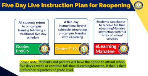Regardless of grade level, parents will decide whether their child or children attend school in person five days a week or continue full-time eLearningManatee at home. Hybrid programs that combine in-school and eLearning will be available for older students.