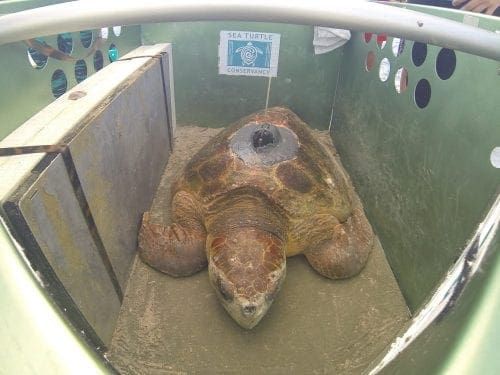 BRADENTON BEACH – Following in the flipper tracks of predecessors Amie and Eliza Ann, a female loggerhead sea turtle named “Bortie” was satellite tagged on Coquina Beach this morning and set free to “race” in the Tour de Turtles marathon.
