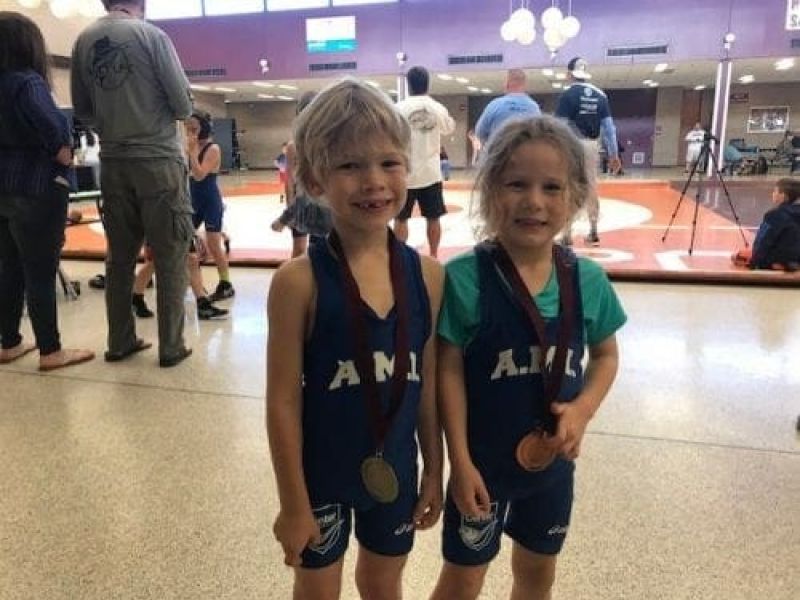 Proud of their wins at the Brandon Wrestling tournament on Saturday, Jan. 12, Andre Harwood and Savanna Phelan pose with their medals. – Submitted