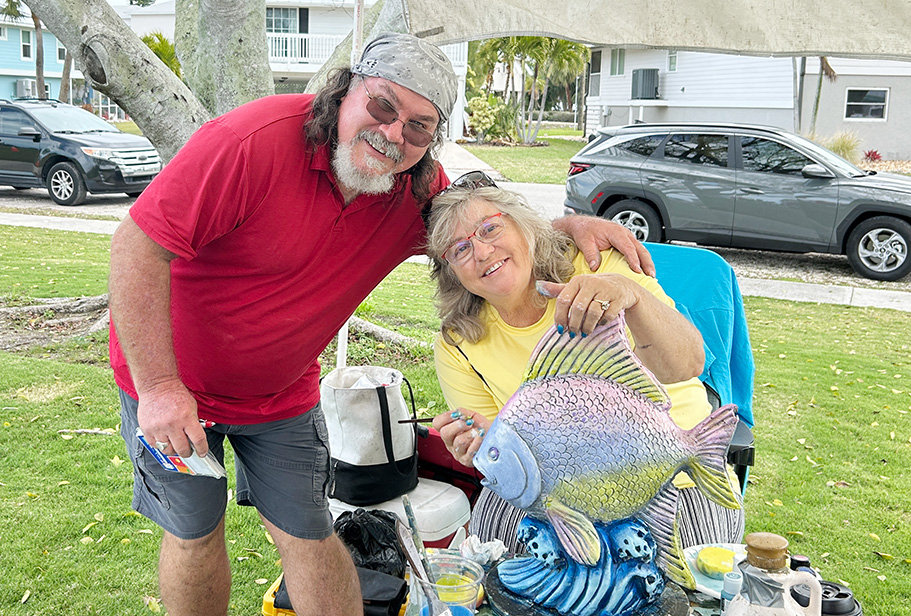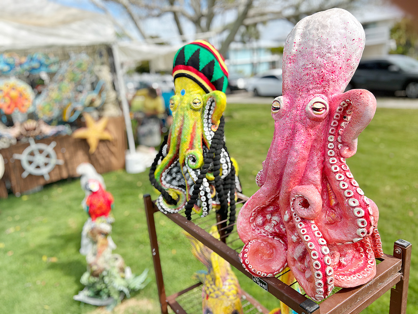 The Art-N-Around booth operated by artists Troy and Susi Parriott of Jensen Beach displayed brightly colored plaster and cement sculptures of animals and coastal figures that included parrots, alligators, coastal birds and octopuses – one of their most requested designs. Troy, and the couple’s son, Jeremy, designed the plaster and concrete figures and Susi hand-painted each piece.