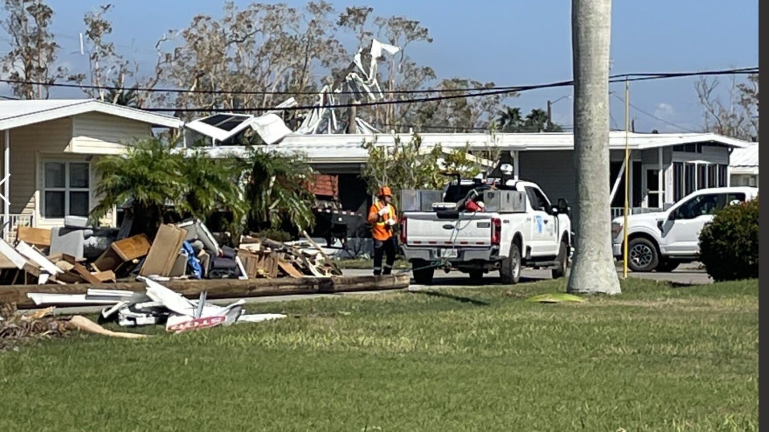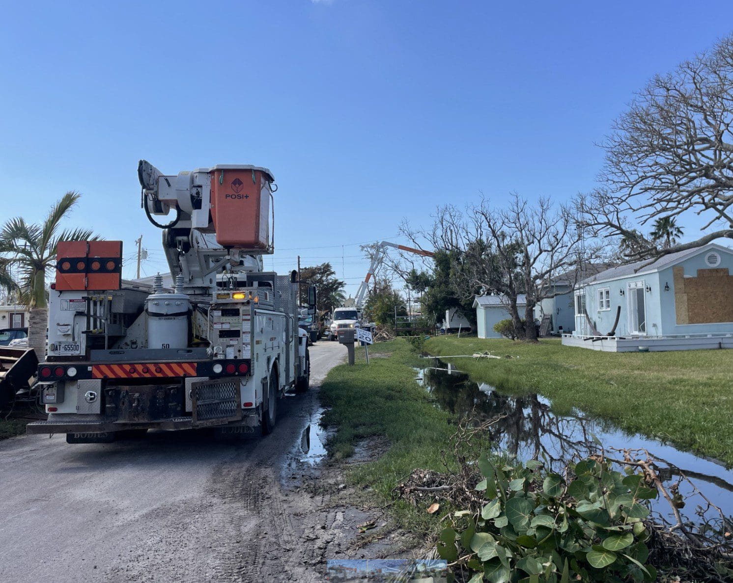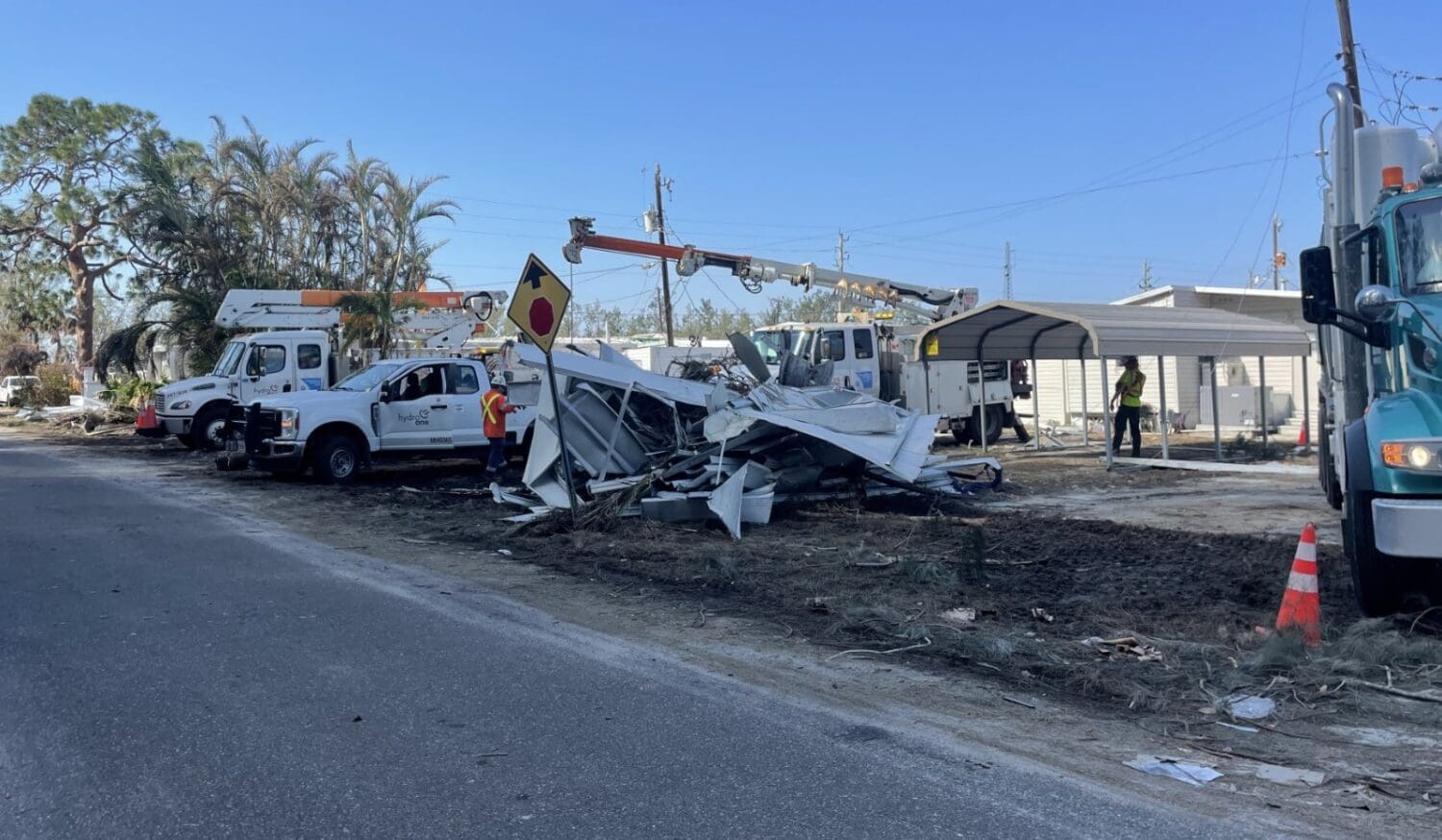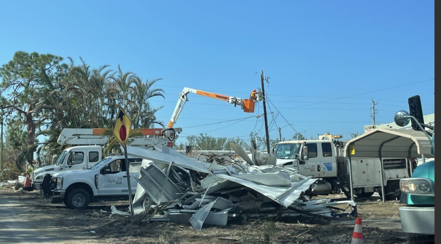 CORTEZ – Multiple crews from Hydro One, an Ontario Canada-based electricity transmission and distribution service provider, navigated their way through debris-filled streets in Sunny Shores to restore electrical infrastructure damaged by the recent hurricanes.
