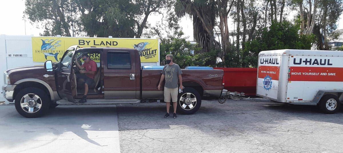 CORTEZ – Swordfish Grill managers Tom Polch, Adam Sears and Bob Slicker delivered a U-Haul trailer filled with donated hurricane relief supplies to the Water’s Edge Gathering church in Lake Charles, Louisiana last Wednesday morning.